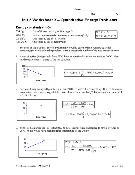 Unit 3 Worksheet 3 Quantitative Energy Problems . If this same amount of energy. This document provides information about energy constants related to phase changes of water and presents 7 quantitative energy problems.